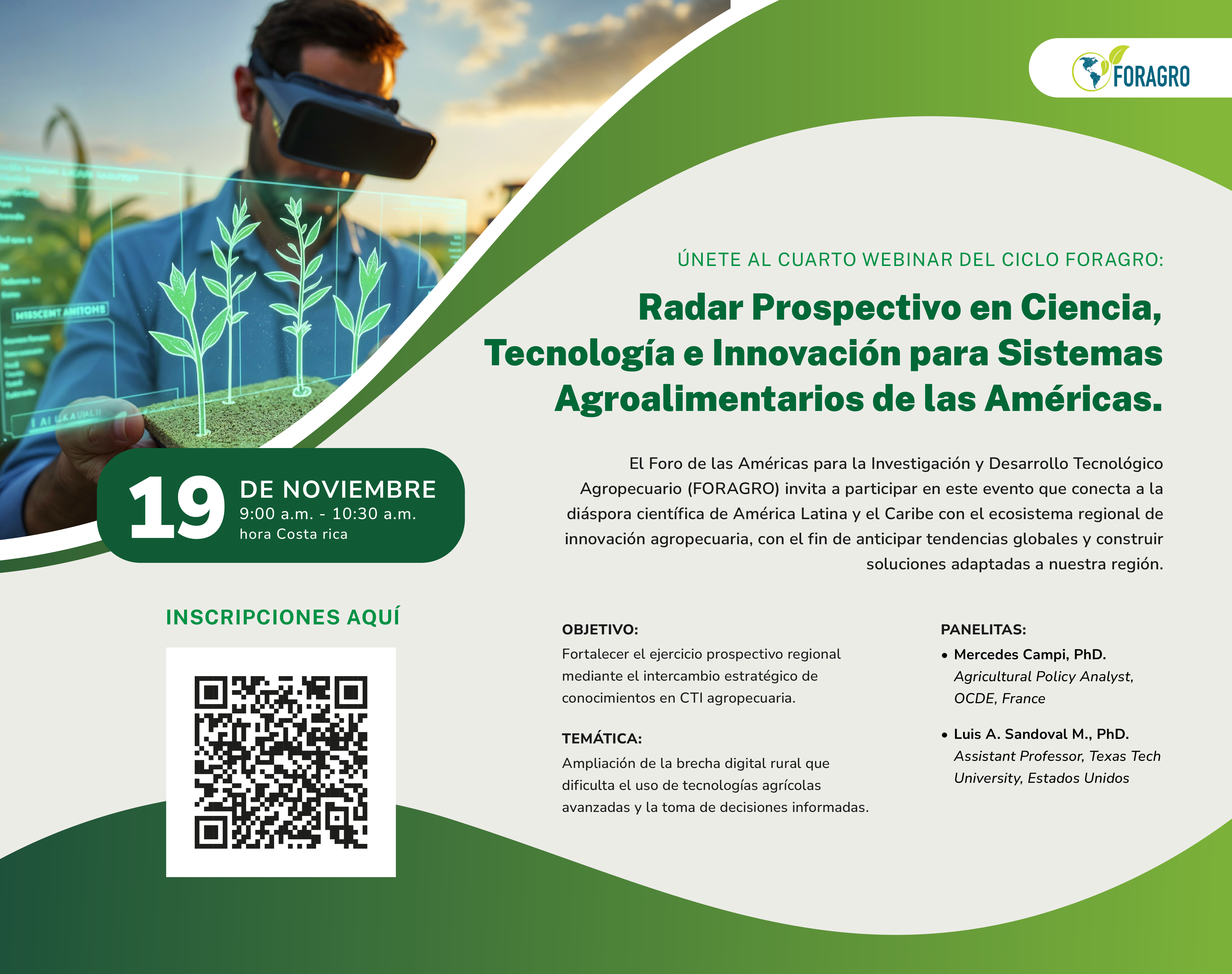 Bogotá, 24 de noviembre de 2025 (IICA) – El Foro de las Américas para la Investigación y Desarrollo Tecnológico Agropecuario (FORAGRO) culminó con éxito un ciclo de webinars que fortaleció el diálogo entre la diáspora científica de América Latina y el Caribe y más de 210 actores del ecosistema regional de ciencia, tecnología e innovación agropecuaria. La iniciativa permitió vincular a 11 especialistas latinoamericanos y caribeños actualmente vinculados a centros de investigación de excelencia en Europa y Estados Unidos, generando un espacio único de intercambio sobre innovación aplicada al sector agroalimentario.